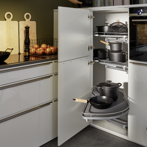 In Ecken wäre es besonders lästig, in den Schrank krabbeln zu müssen. Der LeMans zum Beispiel legt sich für Sie in die Kurve und erlaubt es Ihnen, Töpfe und Pfannen auf verstellbaren Böden bequem zu sich zu schwenken.